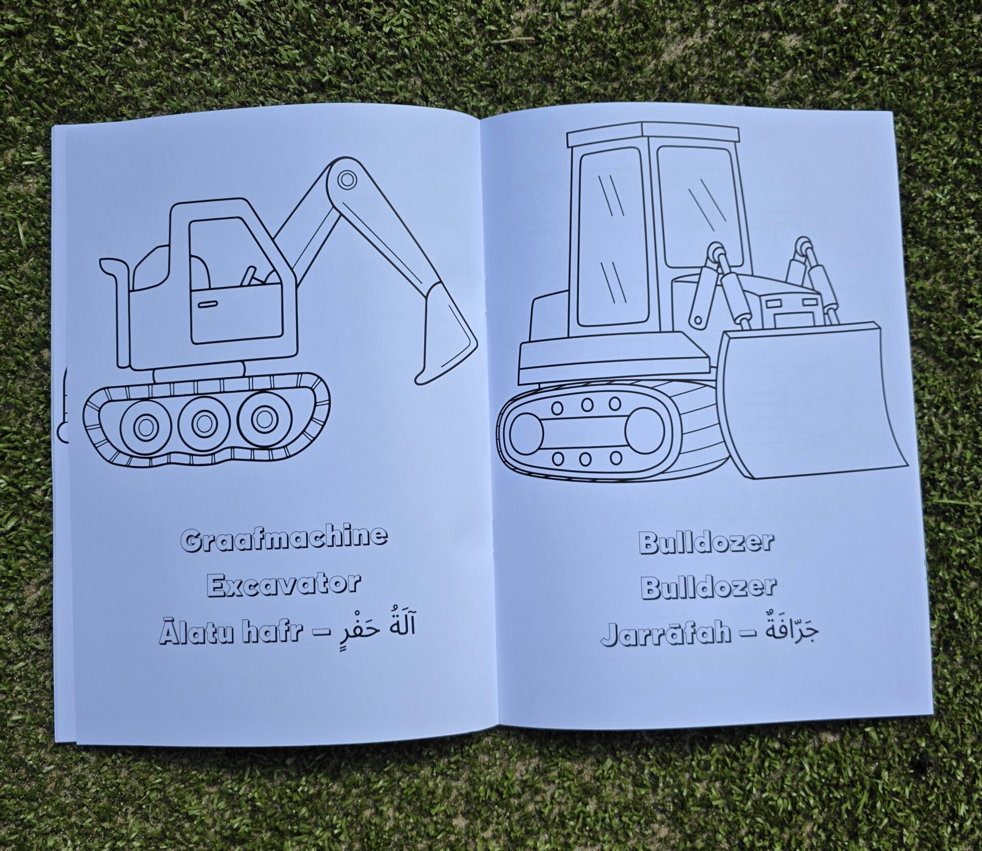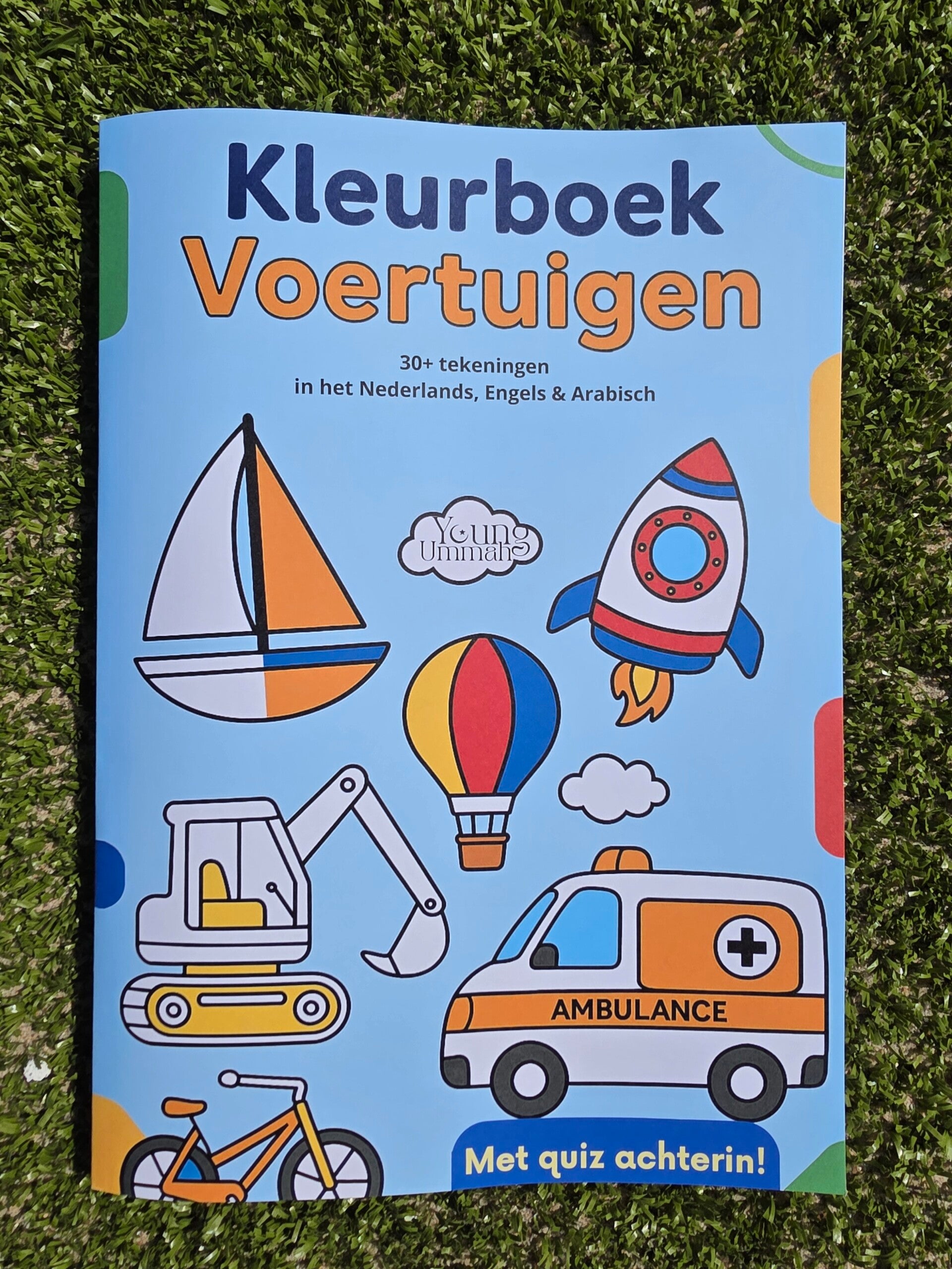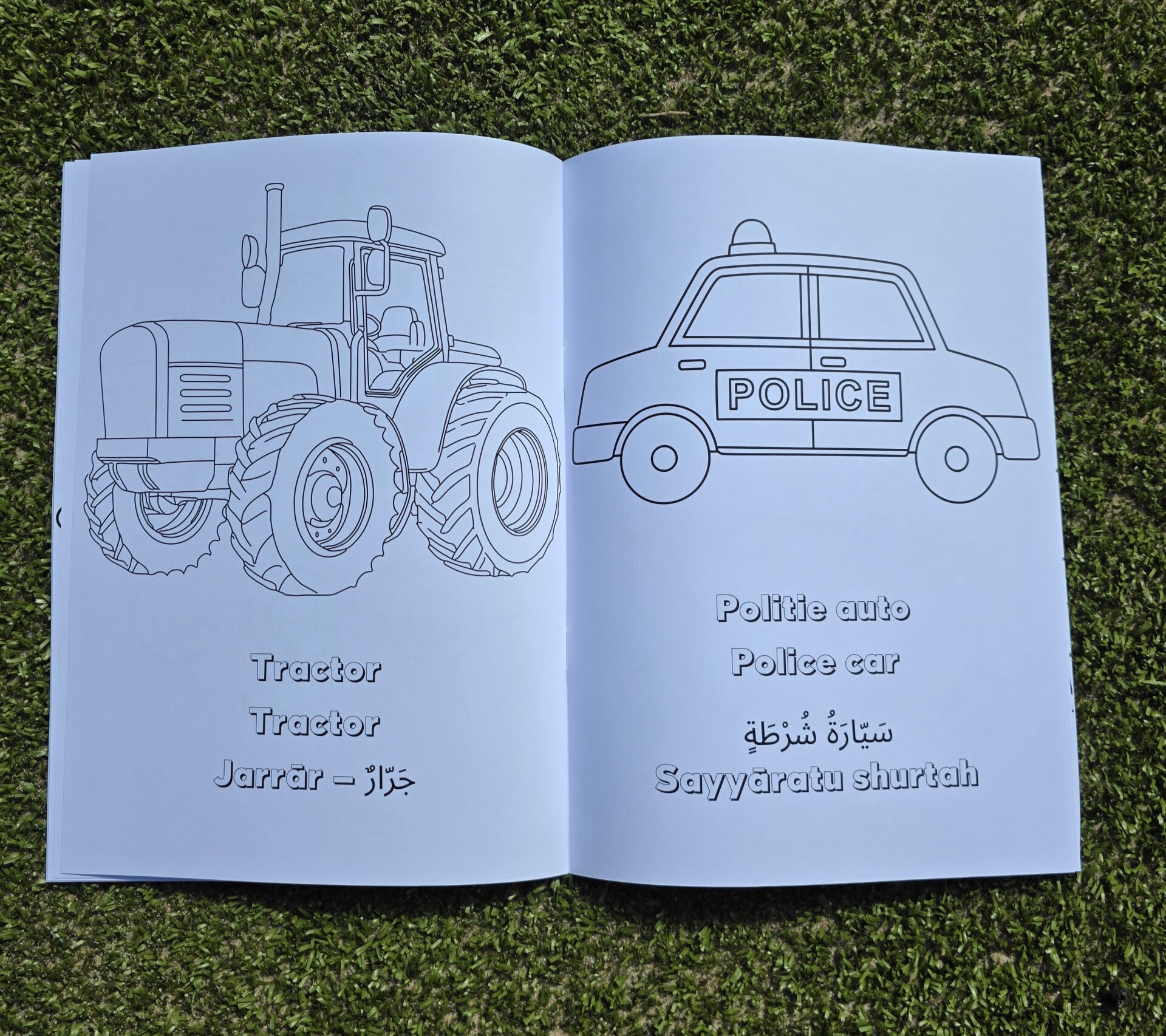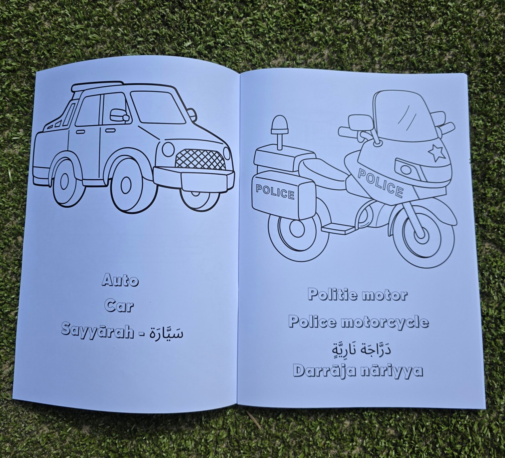 Ons kleurrijke Voertuigen Kleurboek is perfect voor nieuwsgierige kinderen die dol zijn op alles wat rijdt, vliegt of vaart. Met meer dan 30 verschillende kleurplaten, telkens één groot voertuig per pagina, kunnen kinderen zich creatief uitleven terwijl ze nieuwe woorden leren in drie talen: Nederlands, Engels én Arabisch (inclusief uitspraak).